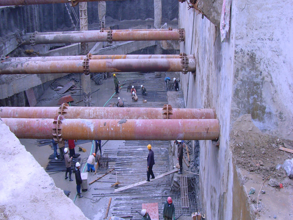 支護型式:東側僅靠靜海寺、天妃宮,采用鉆孔灌注樁加三層鋼筋砼支撐擋土,外圍采用深攪樁止水,其余區域采用SMW工法(三軸深攪樁中插型鋼)加三層鋼筋砼支撐。坑內布置適量疏干井。南北二端支撐呈角撐布置,中間采用對撐,呈桁架布置,挖土方便。為節省造價,支撐立柱樁最大限度利用工程樁。