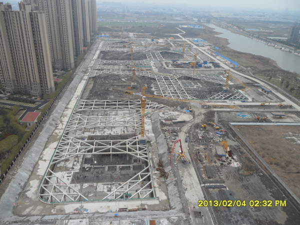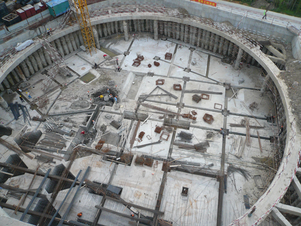 支護型式:基坑采用鉆孔灌注樁加一道砼水平支撐進行支護,支撐體系采用一大一小雙環,大環直徑達128m,雙環之間設置棧橋方便土方運輸。采用雙軸深攪樁止水,深坑部位布設降壓井,淺坑布設疏干井。圓環支撐具有剛度大,挖土空間大的特點,節約造價約300萬且縮短了工期約3個月,取得了良好的社會經濟效益。