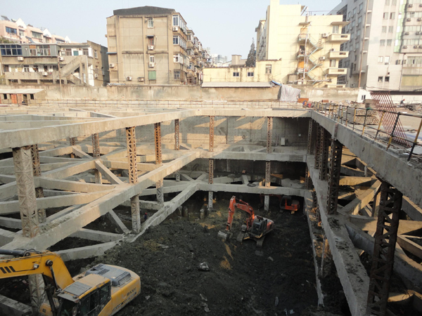 大觀?天地MALL位于南京市熱河路東側,著名歷史文物靜海寺的西側,地上為2~6層購物中心,地下兩層,局部為三層,基坑開挖深度11.8~14.8米,基坑長約305米,寬82~121米,開挖面積約2.78萬平方米。基坑西側距離熱河路最近處12米,北側距離建寧路最近處僅9米,路下管網密集;東側距離靜海寺、天妃宮最近處僅3米,周圍環境相當復雜,且場地土質軟弱,基坑安全等級為一級。